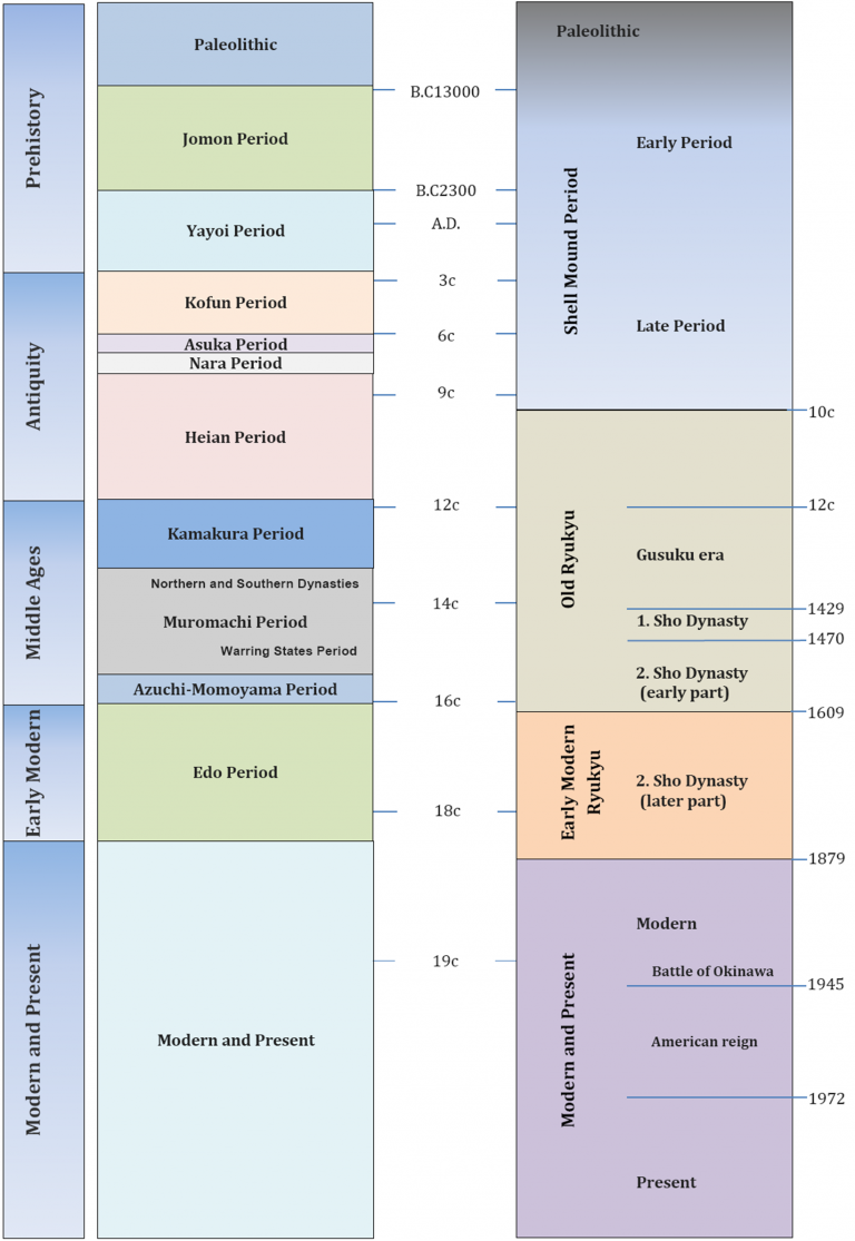 Como ocurre con cualquier región de rica complejidad cultural, existen múltiples propuestas de periodización de la historia de Ryukyu (dividir la historia en periodos históricos), cada una moldeada por distintas escuelas de pensamiento y enfoques metodológicos.