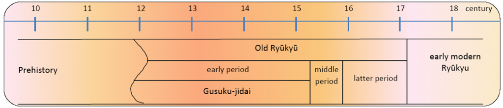 La periodización en cuatro divisiones como una hipótesis de trabajo inmediata defendida por Takara 1989 (I: 2). Contrasta con la transición aceptada de la historia japonesa para facilitar la comprensión.