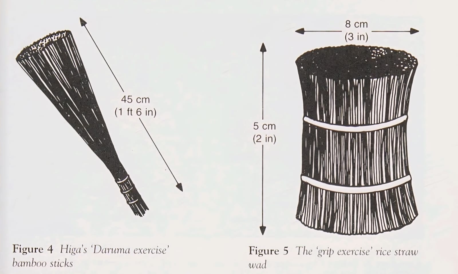 y realiza la secuencia una vez por la mañana, al mediodía y por la noche, afirmando que ayuda a preparar el cuerpo para ser capaz de recibir un golpe en cualquier parte. Durante la entrevista posterior a la sesión, Higa ejercitó constantemente su agarre sobre dos pequeños fajos de paja de arroz que sostenía en las palmas de las manos (uno en cada mano) y que apretaba con los dedos. Afirmó que los había inventado cuando era un colegial de 19 años, y bromeaba diciendo: "Son mejores y mucho más portátiles que los jarrones utilizados en Goju-ryu.