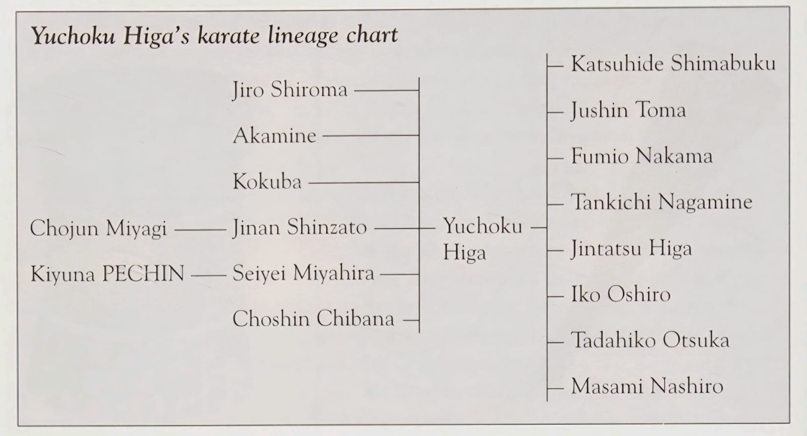 Yuchoku Higa comenzó su entrenamiento de kárate a los 17 años con Jiro Shiroma, quien había sido alumno de Anko lItosu. Shiroma murió cuando Higa tenía sólo 23 años. El padre de Higa, que era constructor en Naha, le presentó a Jinan Shinzato(1), que le enseñó Goju-ryu de forma privada; Chojun Miyagi (2) que era amigo de la familia, a veces le corregía las formas. Al mismo tiempo Higa se entrenó con Seiyei Miyahira, quien, además de ser muy conocido por su potente golpe, era calígrafo y un músico notable, muy versado en varios instrumentos clásicos de Okinawa. Miyahira, que murió en 1958 a los 64 años, había aprendido kárate con Kiyuna PECHIN (también Chunna TANMELI o Tiji-kun BUSHI, es decir, Caballero del Puño Cerrado), que era maestro de Shuri-te. Kiyuna había sido alumno de Sokon Matsumura y, en una época, había sido guardia en las tumbas reales de Tama Uden cerca del castillo de Shuri. De Seiyei Miyahira, Higa aprendió la versión Shuri-te de los katas Seisan y Sanchin.